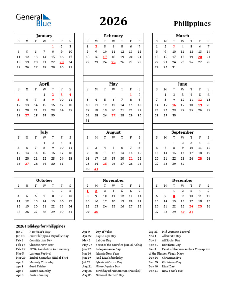 2026 Calendar Streamlined With Holidays Portrait Sunday Start en PH